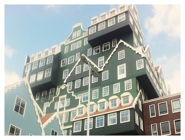 At one of the ancient houses we had another typical Dutch treat: The "boerenjongens pannenkoeken". That translates to "farm boys pancakes". Think that's weird? The hotel on our way home we stopped and stared at was weird! The Inntel Hotel in Zaandam by Dutch architect Wilfried van Winden ... typical Dutch houses stacked on one another. And it looked like a theme park attraction.